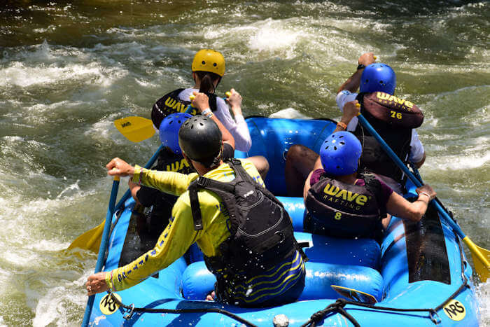 Upon arrival at the river, you’ll be fitted with life jackets, helmets, and a paddle. After a safety talk and quick demonstration, you’ll be off.  You’ll immediately go through some bumpy Class III whitewater rapids. Your guide will call out, asking you to paddle, paddle backwards, lean in, and more. It’s a team effort that is both rewarding and fun.
